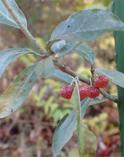 画像左はロシアンオリーブ.花友さんちからやってきた子.赤い実が付いているのに初めて気づいた.ということは花も咲いたということか.