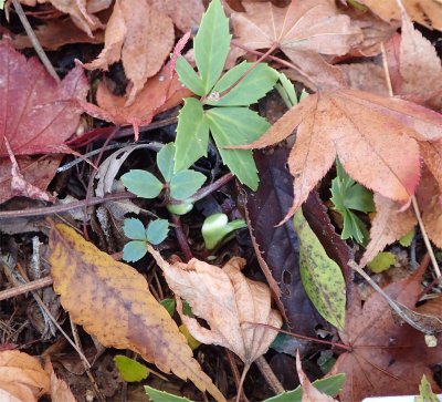 画像右はツルリンドウ.これは庭のあちこちで花を咲かせ実を付けまた領土を拡大しようとしている.環境が合っているようでウチの庭では神出鬼没の「はびこり系」.