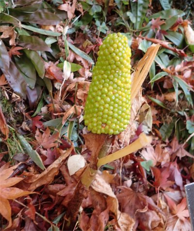 <おまけ>園内散策していて見かけた実もの.ユキモチソウとムサシアブミ.