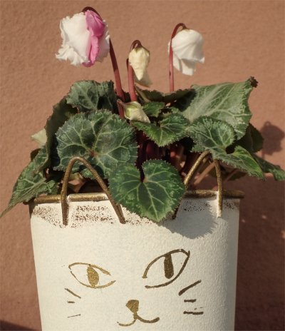 ここは鉢や小物など資材もいろいろオシャレなものが置いてある.なんとなくミヨシのショップにテイストが似ているなぁ,と思ったら同じ卸し元で仕入れているそうな.なるほどと納得.ついでに同時に入手したネコ柄のブリキの鉢(鉢カバー)に入れて記念撮影.(^o^)