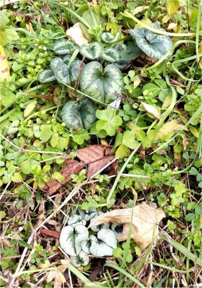 右画像は原種シクラメン・コウム.何株植えたか忘れてしまったがとりあえず違う場所に2株無事に出ているのを確認.上の株は模様葉だが,右の方に大きな模様葉に隠れて模様無し葉があるのが気になる.別の株がもう1つあるのかな?まだ花芽は見られない.