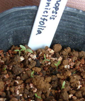 一口に青ケシ仲間と言ってもnapaulensisは他の物に比べ双葉がずいぶん小さい.この3つの中ではgrandisが一番しっかりしているように見える.それにしても青ケシ仲間は種もかなり小さい(鼻息で飛ぶほど)が,新芽も本当に小さい.どれだけの苗が無事にポット上げ出来るだろうか.暖かい日には土がすぐ乾くので要注意.