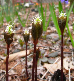 まだ葉は開いていない.花の周囲が葉でくるまれていて.それがパカンと開いて4枚の葉になる.白い部分は花ではなくおしべの集まりだそうな.