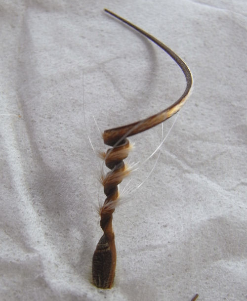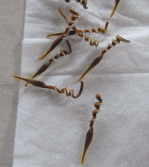 どうやら犯人はシッポ.乾燥するにつれどんどんクルンと回る角度がついて,種の近くではまるでスクリューのようになっている.こうやって地面に落ちた種はどんどん地下へもぐっていくんだなぁ~と思うと,なかなか感動的.ただ,今回は地面ではなく,ティッシュだったので種には気の毒な話だが….(^^;
