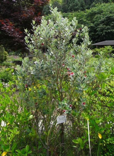 適当にまわっているとフェイジョアを発見.ウチにも何年か前からフェイジョアが居る(タネからのもの)が大きさが段違いに違う.冬場保護が必要とのことでウチでは5号鉢だもんね.(^^; これでは花はのぞめないか.