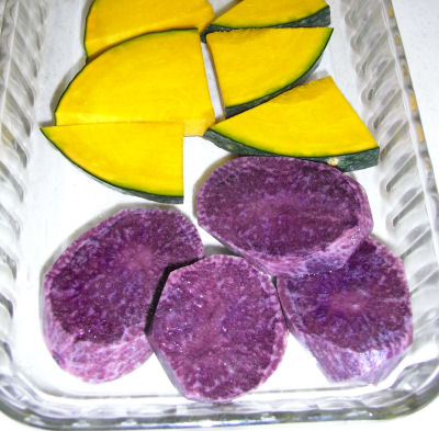 奥はカボチャ,手前はイモ.と言ってもサツマイモではなくジャガイモ.