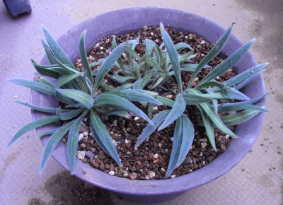雨のやみ間に北バルコニーに出てエキウム(6号鉢)を救出.南ベランダへ移動して一回り大きな7号鉢に植え替え.3株あるように見えるが実はコレ1株.切ったら3株出来るかもしれないが,根が付いておらずヘタしたら枯れそうなのでそのまま植え替え.(^^;
