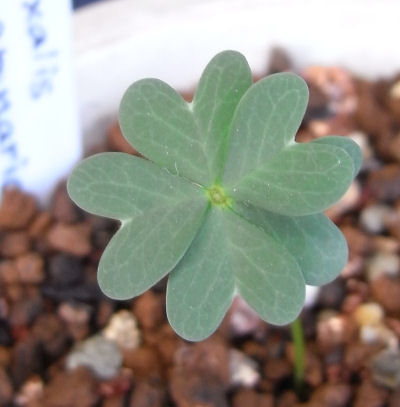 四つ葉のクローバーならぬ五つ葉のクローバー.まだ葉はこの1枚だけ.そのうち次の葉が出てくるのだろうか.初めての植物は興味深い.