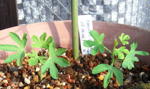 1週間ほど前に大鉢に3株植えにしたカナリー・クリーパー.