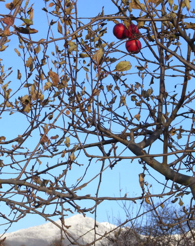 快晴.八ヶ岳は雪化粧.名残のヒメリンゴが数個木に付いている.