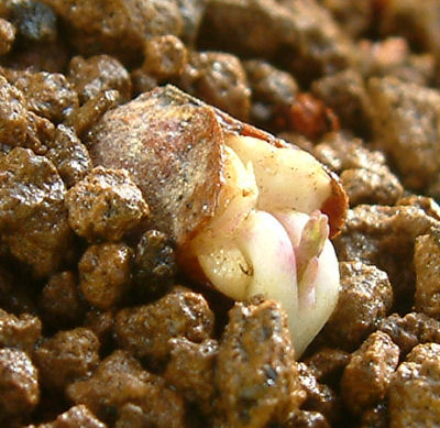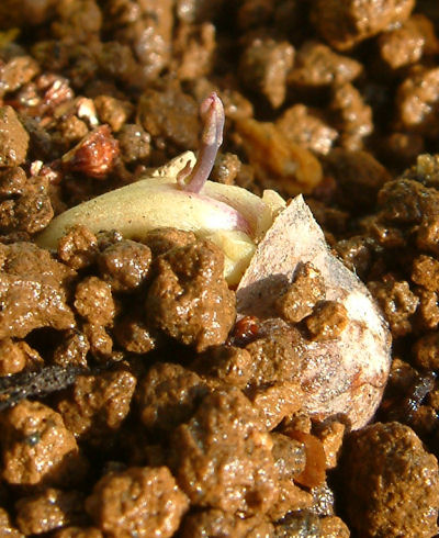 最初は浅い所にタネを埋めていたのだが,根が伸び始めた際,タネ本体が自然に持ち上げられてしまってこんな形に.