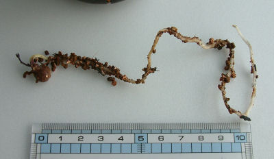08/11/05に種まきしたもの.地上部はほんの1センチほど.それでもポットを下から見ると白いものが見えたのでポットから出してみると…なんという長い根っこ!!(@_@)