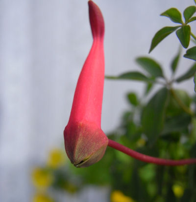 トリコロールみたいな赤.うつむいていた花芽が次第に首を上げて地面と水平になり,「お,いよいよ咲くのか?」と思っていたら,何故かまた下を向いてきた.(@_@)