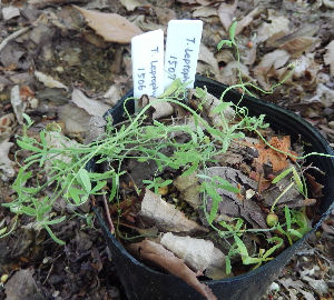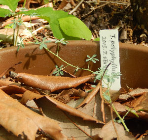 先月黄色の花を咲かせていたのはleptophyllum.すっかり花が終わり種が出来たかと期待していたがスカで残念.画像は葉だけまだ健在の株.他にももう1株葉の健在株がある.花の終わった株をソッと掘って茎を引っ張ってみると抵抗があり,掘り進むと底の方にイモがあった.かなり地下深く潜る性質なのかもしれない.他の枯れた株も近々イモチェックの予定.