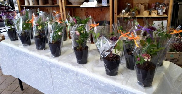 セミナー終了後はジャンケン大会でクリスマスローズ苗の争奪戦.これは広瀬園芸からの苗とのこと.セミナー開始前に後ろの机にズラリと並べられた苗を記念撮影.どの子も美人さん.(*^^*) ジャンケンに勝った人から選んでいくシステム.