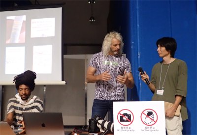 今月発売の書籍.タイトルはBIZARRE EDIBLE PLANTS.著者はJOSEPH SIMCOX(真ん中の人), IRINA STOENESCU(ジョセフさんのパートナー), YU ONOCHI(右端の人:通訳兼).食べられる植物を探して世界中を駆け巡るジョセフさんが突然16時からゲリラ講演をすることになり,講演が始まる前のワン・ショット.左端はフォトグラファーのアンソニーさん.撮影禁止の看板があるが,この講演のみ撮影OKとアナウンスされた.