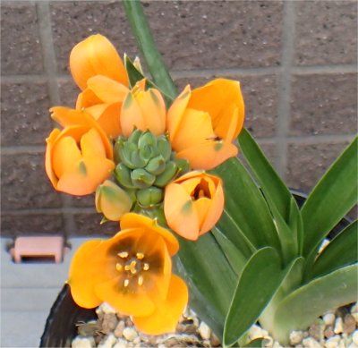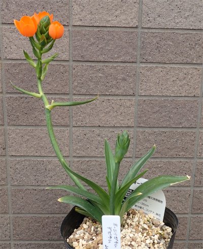 ヒョロンと長い花茎の先にオレンジ色の花が咲いている.