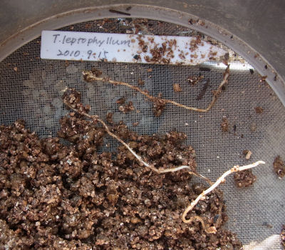 先日の最低気温マイナス5度の日にはガチガチに凍っていた種まきポット.中はどうなっているだろう?とsessilifoliumの種まきポットを探ってみると1つ発芽しているものを発見.鉢底ネットに絡んでいるような感じだったのでポットを引っ繰り返してみた.