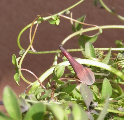 思った通り,根っこが鉢底ネットの目を通り抜けていた.この品種,ホント先に根が伸びる.画像も種から出ている左側の長い方が根,右が芽.