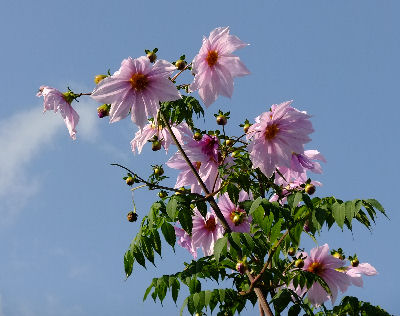 そろそろ…と思うとちょっと散歩コースを変えて開花を見に行く.青空をバックに咲く皇帝ダリアはいつ見ても見事.道行く人は見上げて楽しいが,栽培しているご本人はお家の二階から見下ろして鑑賞しているのだろうか.