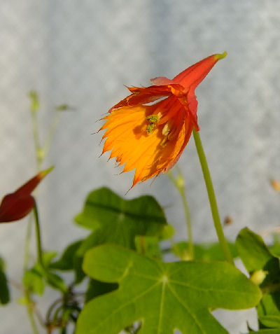 花は鮮やかなオレンジでT.majusにも通ずるような花色.赤い距は長く,一番先端部は薄緑色.花弁の縁はギザギザで個性的な花.