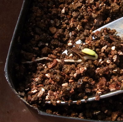チョロンと横からはみだしている小さな緑を見つけたので,「お,双葉になろうとしているのか」と思い,種の殻帽子をソッと引っ張ってみた.少し硬かったけど無事にとれた.ただ,とる前から少しくびれていたようで,折れる寸前のような感じ.