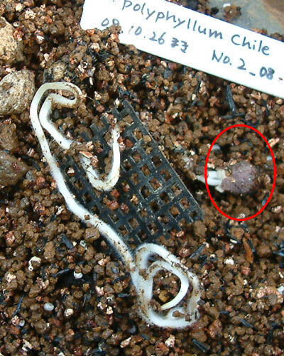 画像赤丸印が種の部分.ほとんど芽が出ていないのに根は凄い.ポリフィラムって根が20センチ以上になってようやく芽が出てくるような感じ.