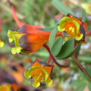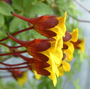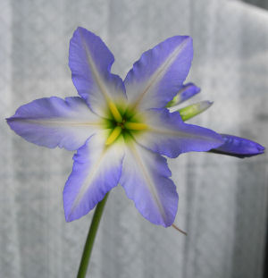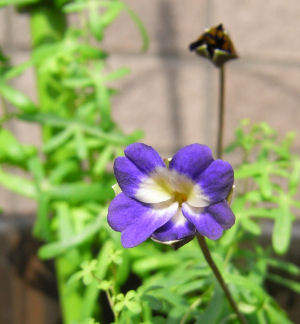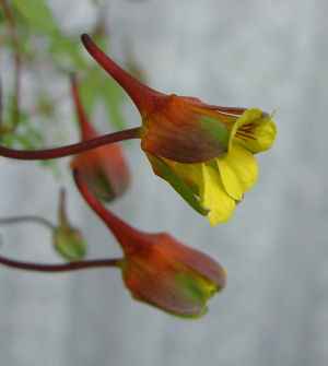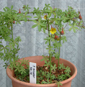 そう,ガクの黒い部分が消えている!そして花弁の開き方も11号に比べて拡がっている.おちょぼ口のはずのトリコロールが大口開けてる感じ.(~_~;) ということは,13号は交雑トリコロールか.距はぐーっと長くて,これはトリコロールの特徴を受け継いでいる.