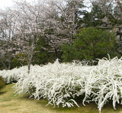 万博記念公園・日本庭園にて.見事なユキヤナギとバックには桜.