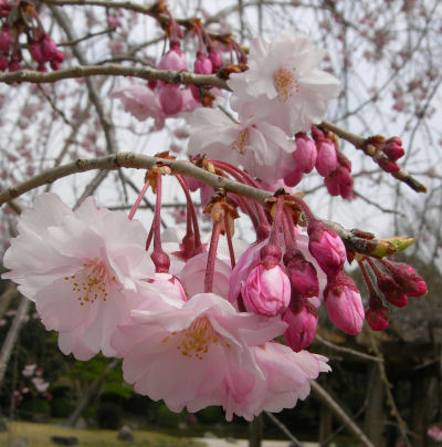 桜は満開のものもあれば,まだこれからというものもあり,週末くらいまでは楽しめそうな雰囲気.園内でピンクのしだれ桜が可愛かったのでアップで記念撮影.青空を背景に撮りたかったけど,花曇りでちょっと残念.