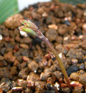 一ヶ月ほど前,花芽に気づいたもの.その後ゆっくりと花茎が伸びて来ている.