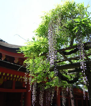 「藤の園」で終わった花房を1つ1つ取って手入れされている人がおられたので声をかけてみた.今年の藤はどうでした?と尋ねてみたところ,天候不順でもう一つだった,との答え.おまけに観光客が大勢訪れるので,藤の樹勢がだんだん衰えているとか.藤は根が30mも張るんだそうで,人がたくさん来るとその分根が傷むらしい.特に本殿の砂ずりの藤は多くの観光客に根を踏まれている事になり,弱ってきているそうだ.こういう話を伺うと藤が気の毒で複雑な心境だ.