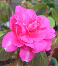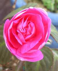 「バラ?」と思うようなつぼみだった八重咲きインパチェンスが開花.直径4~5センチくらい.ゴージャスな花だが,1輪だけで寂しい.このような花がこぼれんばかりに咲いたらさぞ美しいだろう.