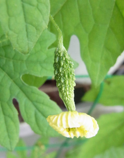 先日初めて雌花が咲いた.開花中から花の下部はゴーヤ型をしていて面白い.今日見ると花は落ちて実の部分がほんの少し大きくなっているような感じ.