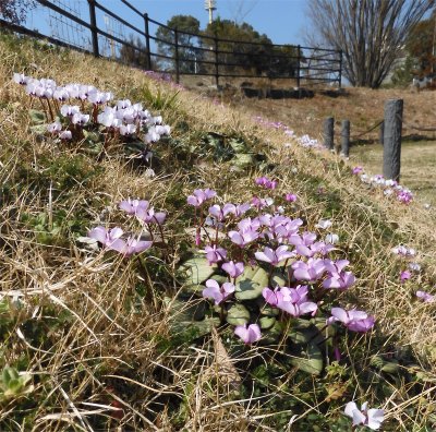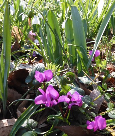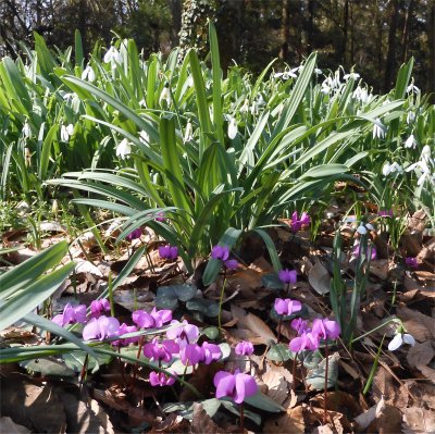 暖冬で花が終わっていないか気がかりだったスノードロップは,最盛期を過ぎたもののまだ開花中.群落の合間ではあちこちにコウムが開花中.白とグリーンの中にピンクが目立つ.