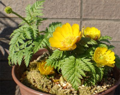 前にブッシュカンを頂いた園芸店で入手したフクジュソウ.詳しい品種は不明.ガク片の様子では東北かな?