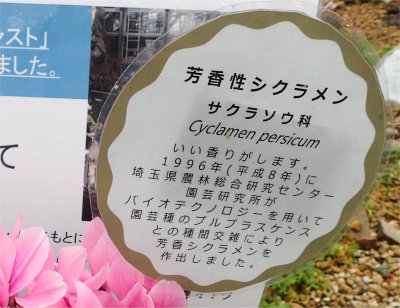 右画像の説明文によると「芳香性シクラメン サクラソウ科 Cyclamen persicum いい香りがします.1996年(平成8年)に埼玉県農林総合研究センター園芸研究所がバイオテクノロジーを用いて園芸種のプルプラスケンスとの種間交雑により芳香シクラメンを作出しました」とある.