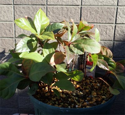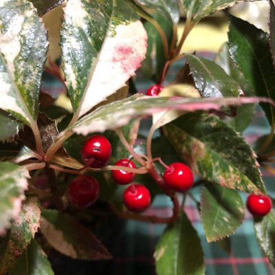 売り場をウロウロしていて斑入りの赤い実を付けたこの植物が目に付いた.あっ,斑入りのチェッカーベリーがある!と思ってカゴに入れた…(おいおい)チェッカーベリーでないことにはすぐ気づいたが…