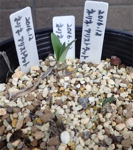 ネット情報によると緑になった葉は斑入りには戻らないらしい.う~ん,引っこ抜こうか…とも思ったが,挿し芽を下さった方とお話出来て「春になったら斑入りの新芽が出ますよ」とのこと.早まった事をしなくて良かった~.(^^; という訳でこの株は来春まで様子見.