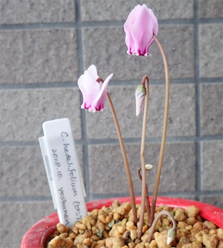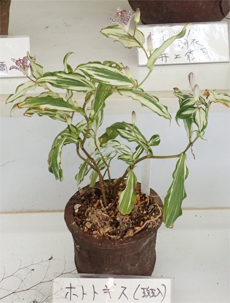蓼科でも咲いていた斑入りホトトギス.関西で栽培するのは難しくないのかなぁと思いつつ拝見.そして原種シクラメン.名札は「ネオポリタナム」となっている.「もっとシクラメン」本によると,「1970年代まではヘデリフォリウムがネアポリナタム(C. neapolitanum)として扱われていた」とある.きっとこのシクラメンの持ち主は古い世代の人なんだろうなぁ.(^^;