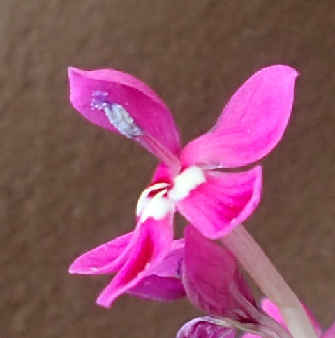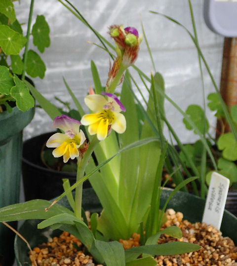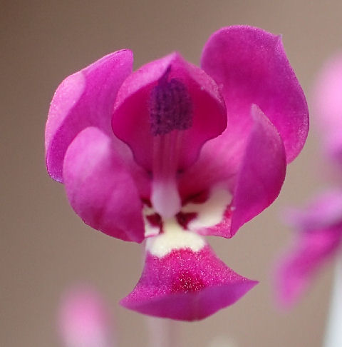 実はこの花,ラペイロージア・オレオゲナとコチョコチョしてみたもの.某園芸店スタッフの話ではラペイロージアは自家受粉しない,うまく受粉できた時は花首がポキッと折れる…という事だったが,これが「ポキッ」なのかどうかは分からない.そもそも品種違いで雑種が出来るのかも分からないが….(^^;