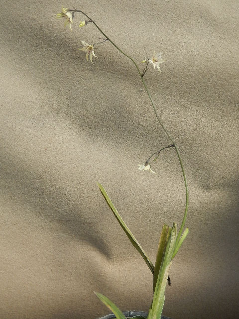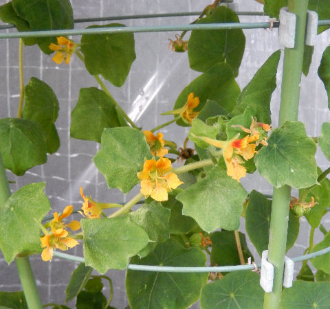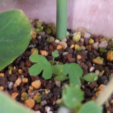ところがクリーム色の方でつい先日まで咲いていたのはサーモンピンクの花.(画像右)これ,1つのイモだと思うんだけど,花色変化してこんな花になるんだろうか?