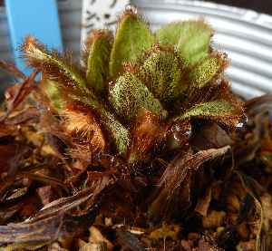 なんとまぁ立派な株!セミナー参加者の女性がご自宅から持参されたもの.6年くらい経っているとのことで昨年はたくさん咲いて種もとれたが,今年は真ん中付近に1つ2つ花芽があるだけで,これは咲かないんじゃないかなぁとおっしゃっていた.