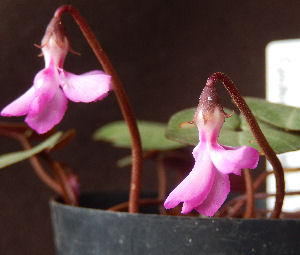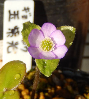 「葉の先端が突然変異で3~5裂に分枝して金魚の尾のようになっているのが特徴です.花は濃桃色,一重です.花期:2~4月」とあった.