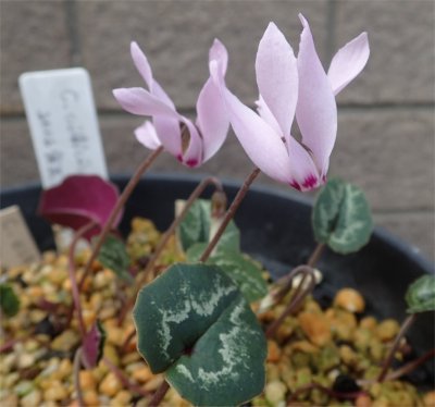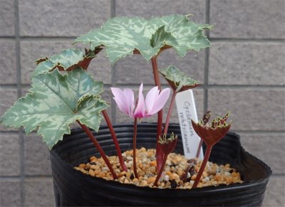 セミナーがあるのかどうか,何時からなのか,情報を持たないまま行ったがちょうどタイミング良く11時からのセミナーにぎりぎり間に合い,横山節の名講習も聞け,展示されている原種シクラメンの年代物(画像左:10年以上選手がゾロゾロ)も見る事が出来て大満足.画像右は特大ヘデリフォリウム@40年物.1円玉を乗せて球根の巨大さを実感.