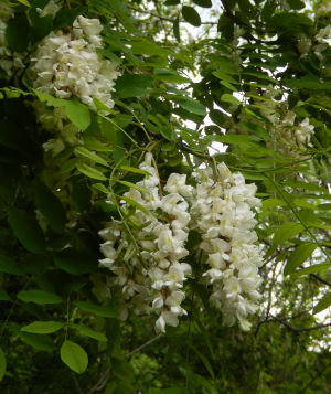 この時期どこでも見かけるフジみたいな房になった白い花.
