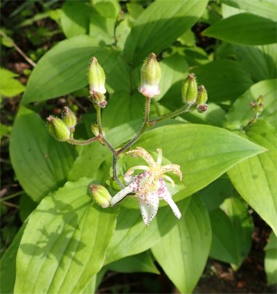 ホトトギスと言えばピンクの花色を思い浮かべるが,この株は白っぽい花色でドットは控えめ,全体的に「淡い」印象.