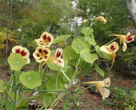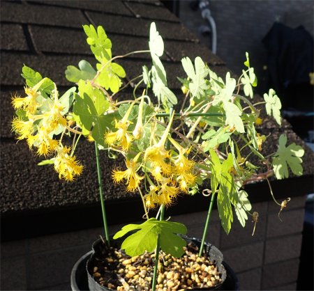 で,目にするのは画像のような光景.近くの鉢に茎を伸ばし,茎同士が絡まったり相手の支柱に絡みついたり.(~_~;)