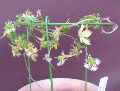 このままではマズイ.そこで戸外の無加温ビニール温室に入れられるよう,支柱の背丈を低いものに交換.と文字で書けばたやすそうだが,これがまた大変.ぐるんぐるんと輪っかに巻き付いた茎を丁寧に外していかなくてはならない.途中で花芽がいくつかぶっ飛ぶ.