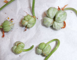 この鉢で使っているのは赤玉土とバーミキュライト,それにわずかな腐葉土.一般的な土を使用している.他に山野草の土を使っている株もある.比較すると前者は地上部の伸びが良く,後者は細根がよく出ている.また,両者を併せたミックス土を利用した株では茎も長く伸びているし細根もよく発達している…という興味ある結果が見られた.ただ,数鉢だけの実験なのでこれは単なる個体差かもしれない.